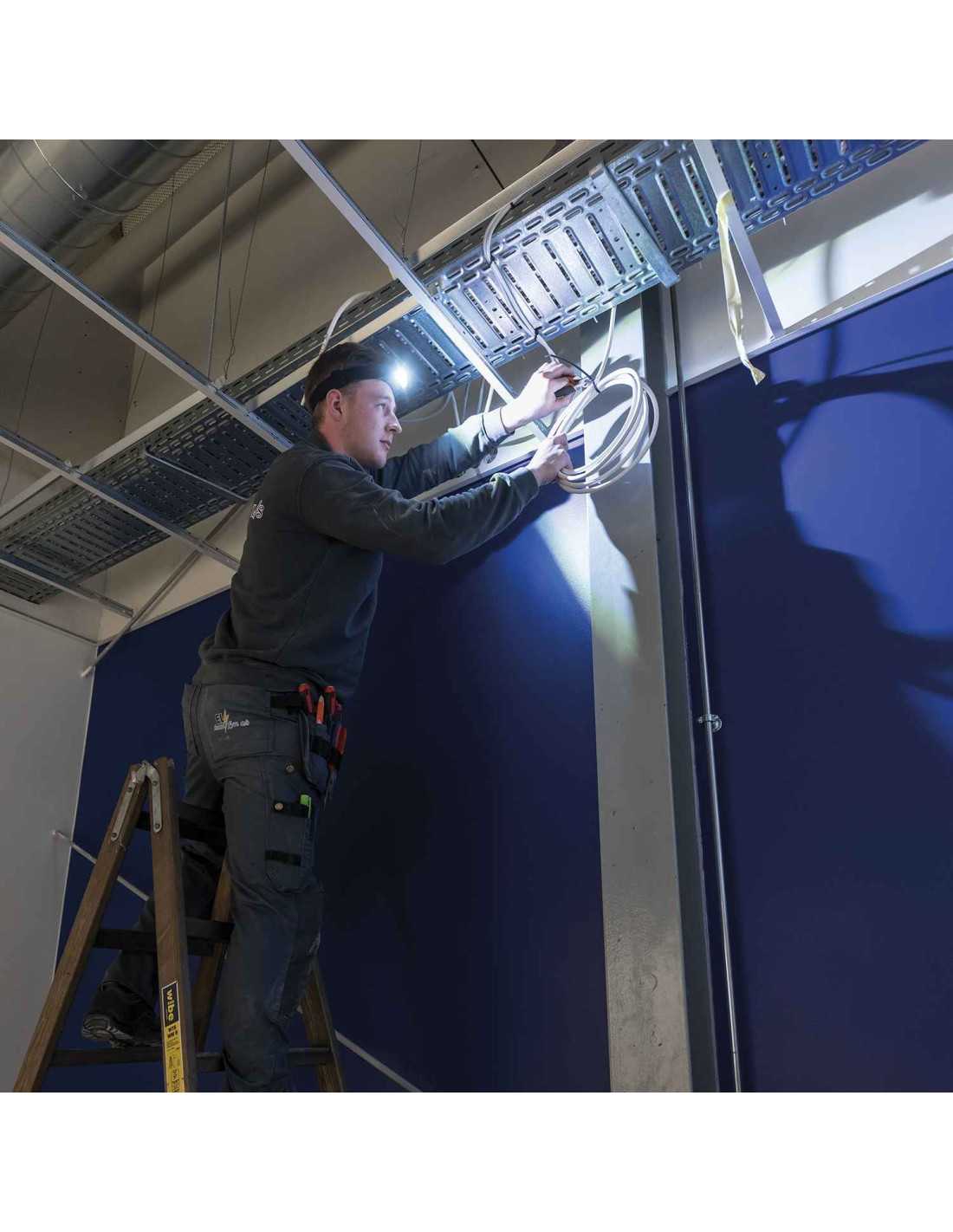 The waterproof headlamp (IP54) is designed to provide optimum work light illumination with 2 different lighting functions in one: a floodlight beam angle illuminating your entire work area and a focused beam angle for inspection or long-distance use. The lamp head is easily adjusted to obtain the optimum work lighting angle