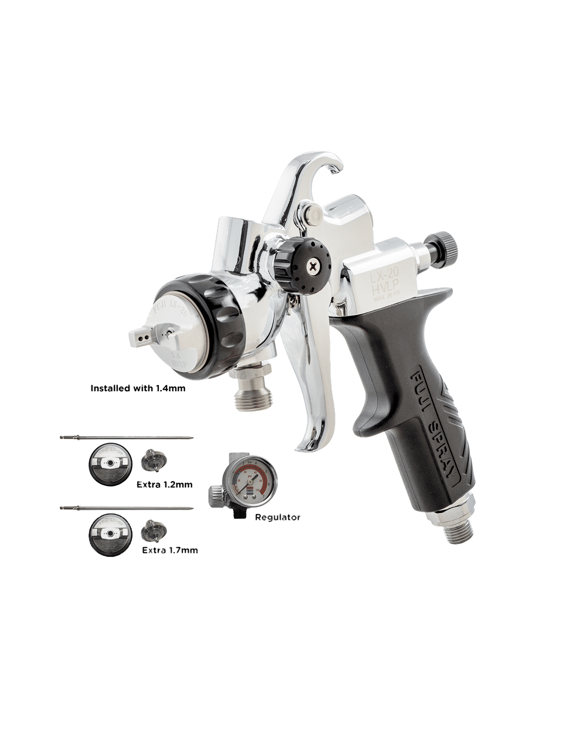 The LX-20™ spray gun has been designed to replace conventional high-pressure spray guns. It is available in gravity feed or pressure feed models. Fuji HVLP compressor spray guns are well known for higher transfer rates. Especially suited to wood finishing and any fine-finishing application.