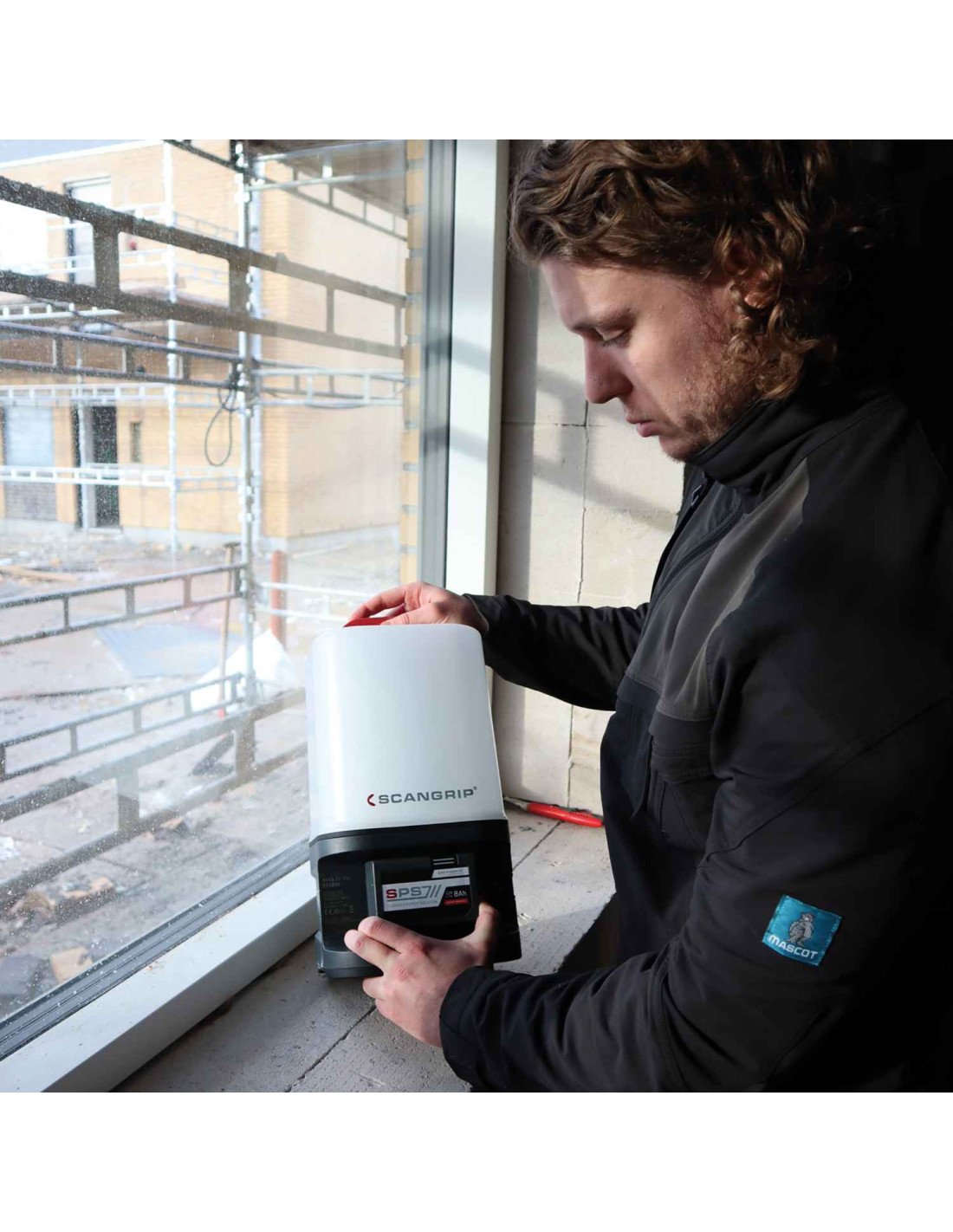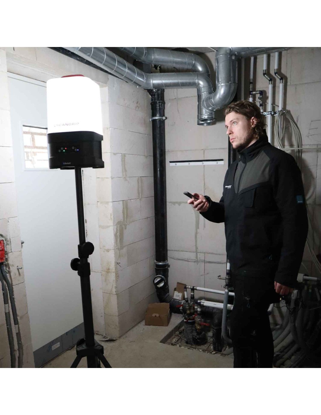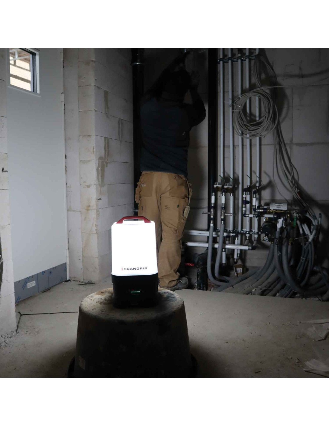 La luz de inundación LED se suministra con un gancho flexible y se puede colocar, por ejemplo, en una tubería o montarse directamente en el TRÍPODE SCANGRIP.