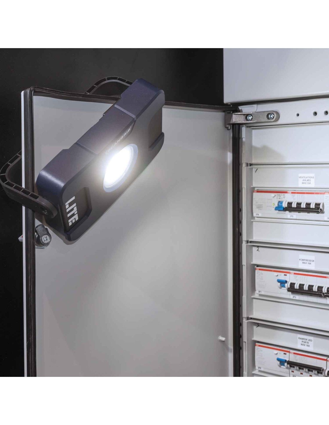 El FLOOD LITE M es un reflector LED liviano de 2000 lúmenes fácil de transportar de un trabajo a otro. La carcasa robusta y duradera del reflector está hecha de un material plástico altamente resistente a los golpes, construido para su uso en entornos de trabajo exigentes.