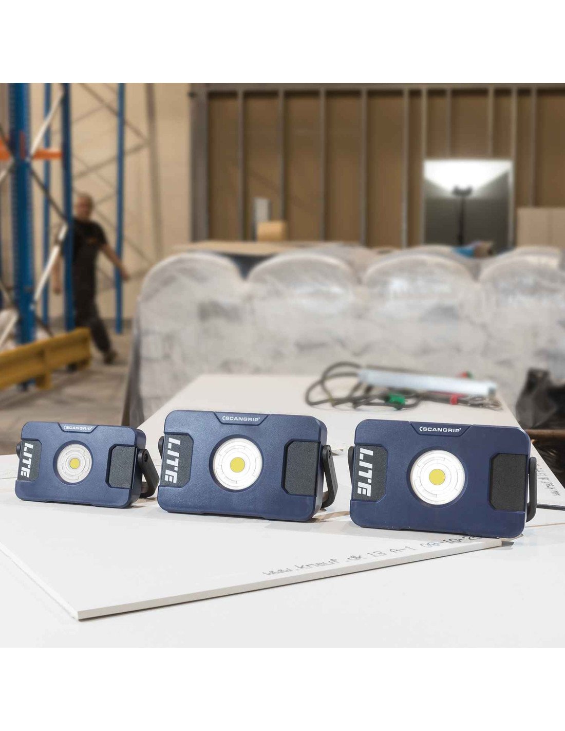 El reflector LED se puede colocar en el TRÍPODE SCANGRIP proporcionando una solución de iluminación de trabajo estacionaria en una altura de hasta 3 m. Si se solicita una solución de iluminación móvil, el FLOOD LITE S se puede montar en el SOPORTE DE RUEDAS SCANGRIP. También está disponible como accesorio opcional un soporte doble para colocar dos lámparas.