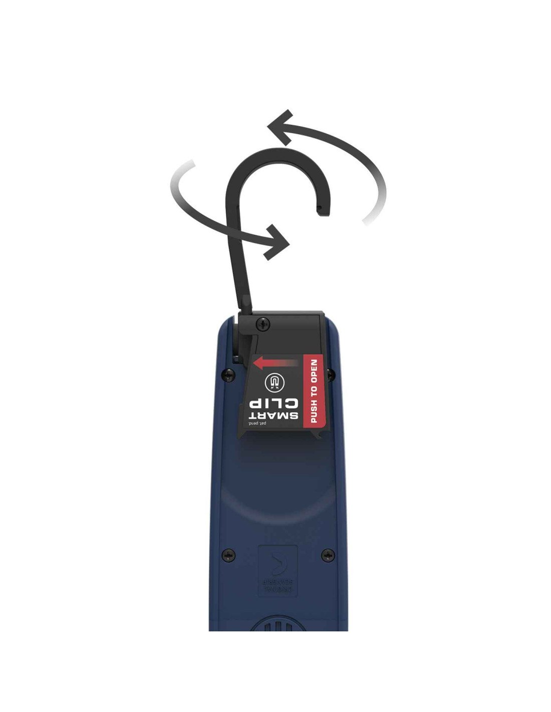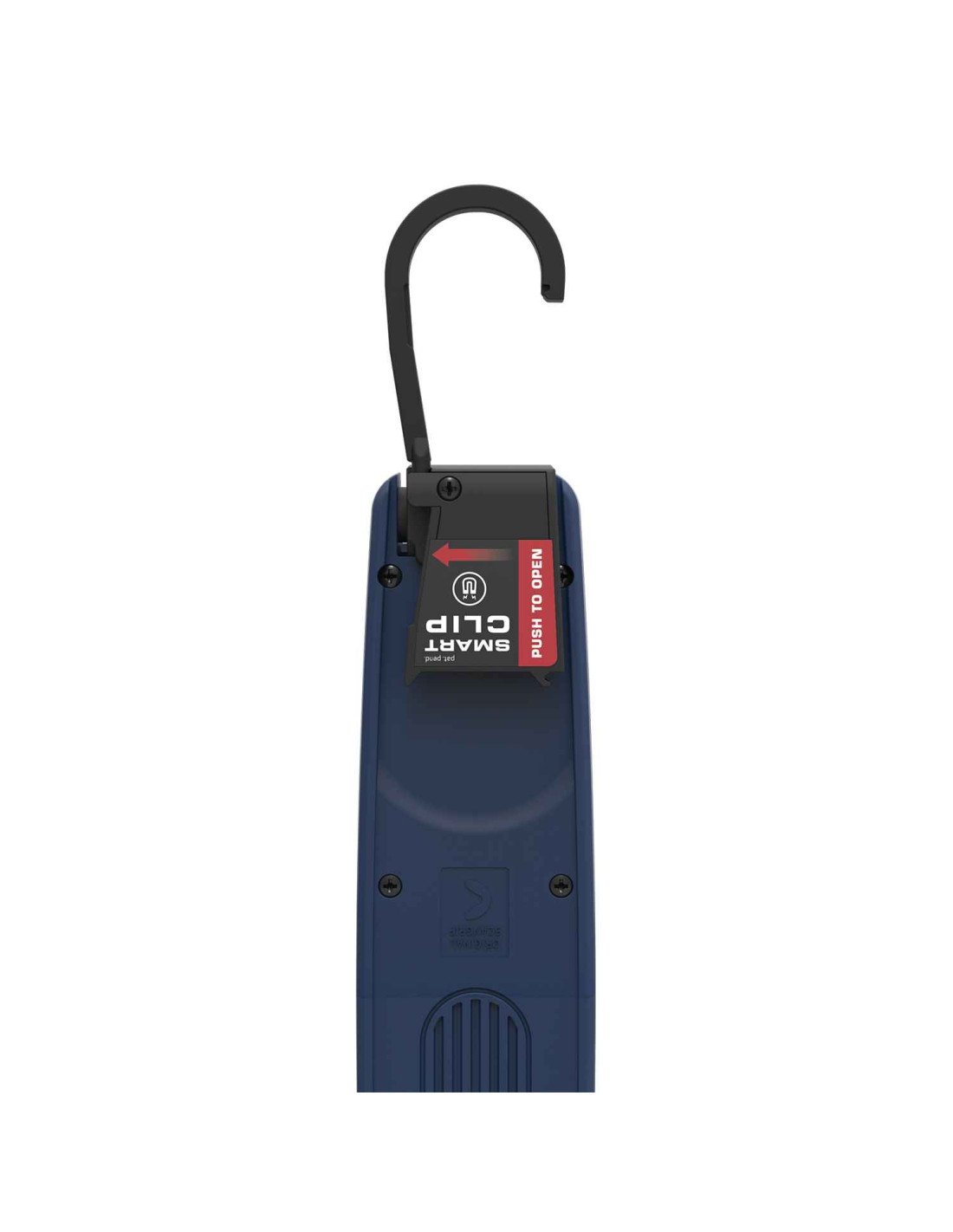 La posición flexible de la lámpara de inspección cuando se necesitan ambas manos se puede obtener mediante el potente imán incorporado o mediante el gancho giratorio y retráctil. Además, el SMART CLIP se puede utilizar como soporte en cualquier superficie disponible.